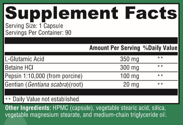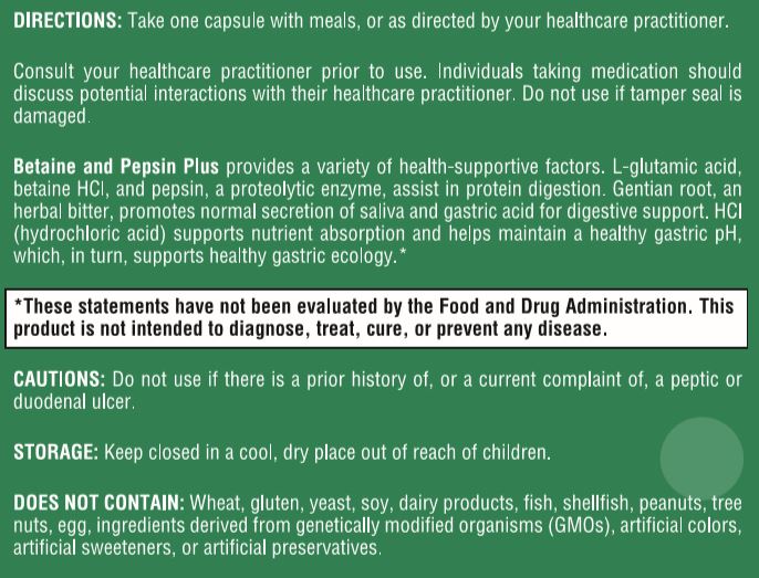 Betaine and Pepsin Plus: a supplement containing L-glutamic acid, betaine HCl, Pepsin, gentian root, and HCl for optimal protein digestion and healthy gastric function.
