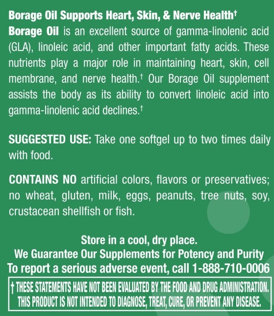 Borage oil is an excellent source of gamma linoleic acid (GLA) and other important fatty acids. These nutrients play a major role in maintaining heart skin cell membrane and nerve health.