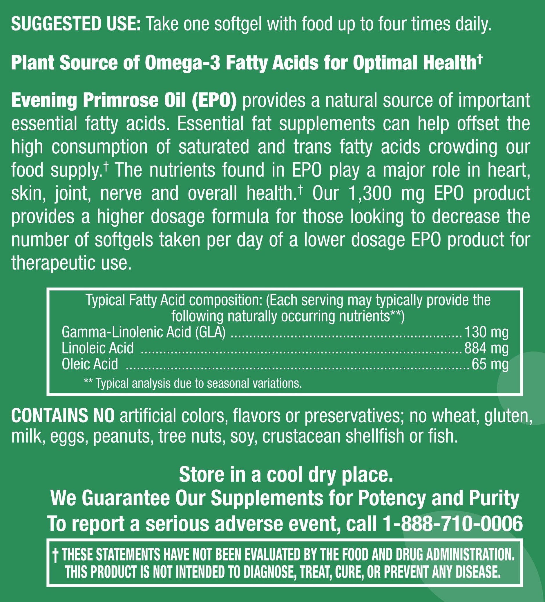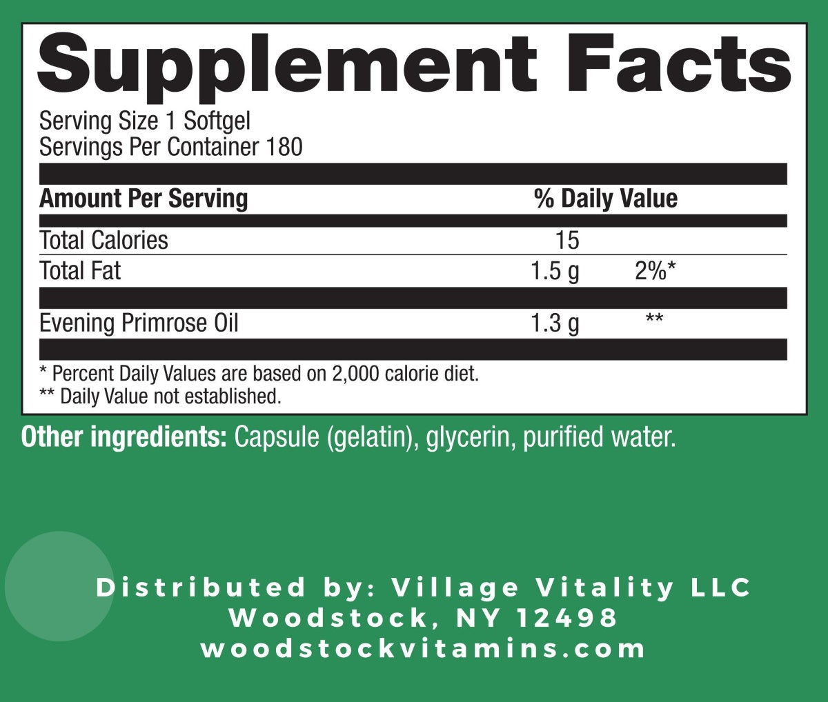 Woodstock Vitamins Evening Primrose Oil (EPO) provides a natural source of important essential fatty acids. Essential fat supplements can help offset the high consumption of saturated and trans-fatty acids crowding our food supply.