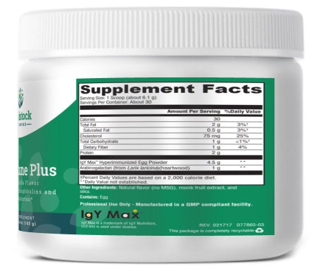 The formula contains powdered hyperimmune egg, which naturally provides IgY and immunoregulatory factors, and larch arabinogalactan, a dietary prebiotic fiber. Human studies on the supplementation of these ingredients suggest they boost the body’s potential to defend itself against immune challenges.
