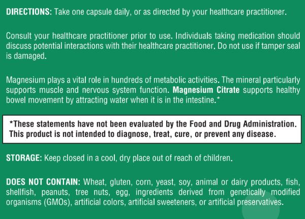 Magnesium plays a vital role in hundreds of metabolic activities. The mineral particularly supports muscle and nervous system function. Magnesium Citrate supports healthy bowel-movement by attracting water when it is in the intestine.