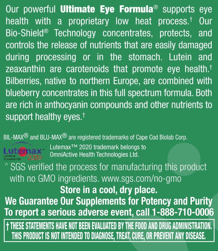 Our powerful Ultimate Eye Formula® supports eye health with a single capsule daily. The proprietary, low-heat, solvent-free manufacturing process makes our formula different from all other bilberry products on the market.