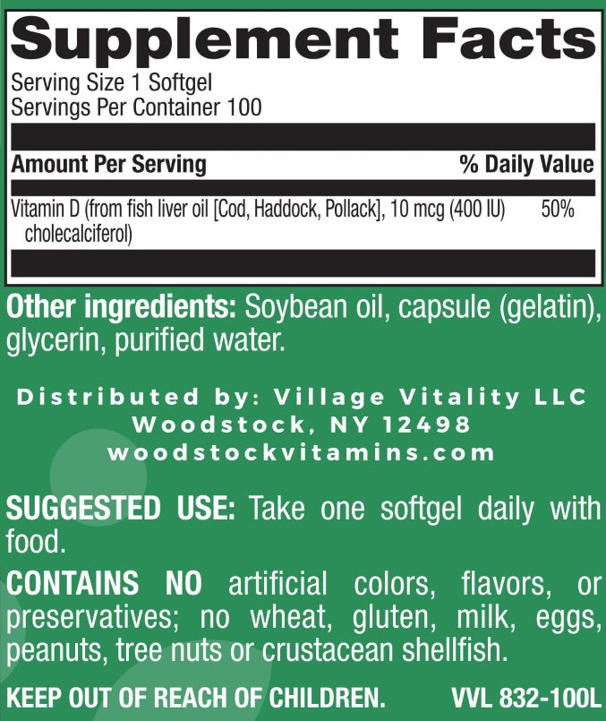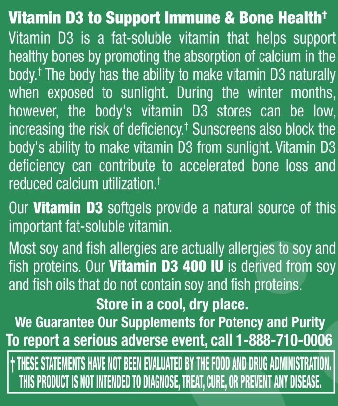 Village Vitality Vitamin D3 is a fat-soluble vitamin that helps maintain healthy bones by stimulating the absorption of calcium in the body. The body has the ability to make vitamin D3 naturally when exposed to sunlight.